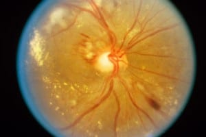 يمكن أن يتلف ارتفاع ضغط الدم الأوعية الدموية في الشبكية، والتي تظهر في هذه الصورة عند استخدام منظار العين. كلما كان ارتفاع الضغط أعلى وكلما كانت مدة الإصابة به أطول، كان احتمال حدوث تلف في الشبكية أعلى. لا يشكو الكثير من المصابين باعتلال الشبكية بارتفاع ضغط الدم من أية أعراض حتى يصلون لمرحلة متأخرة من المرض. وهذه الأعراض قد تكون على شكل رؤية مزدوجة أو باهتة، وصداع، ومشاكل بصرية، وفقد الرؤية.